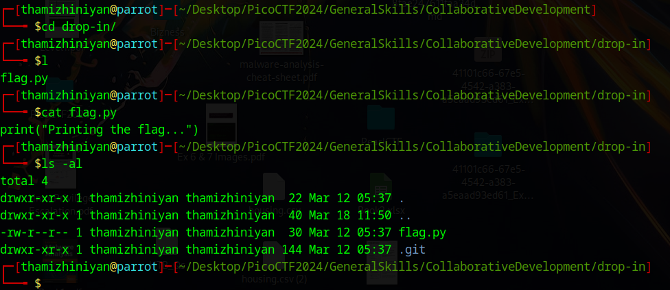 Download the given file and extract it. You can find .git directory in the given folder, which means git has been initialised. There is file named `flag.py`, which prints `Printing the flag...`.