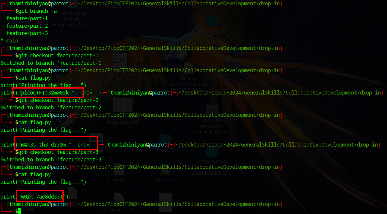 Since the challenge name is collaborative development, I looked out for other git branches and found three branches. The flag has been broken down into parts, each part is given in each branch.