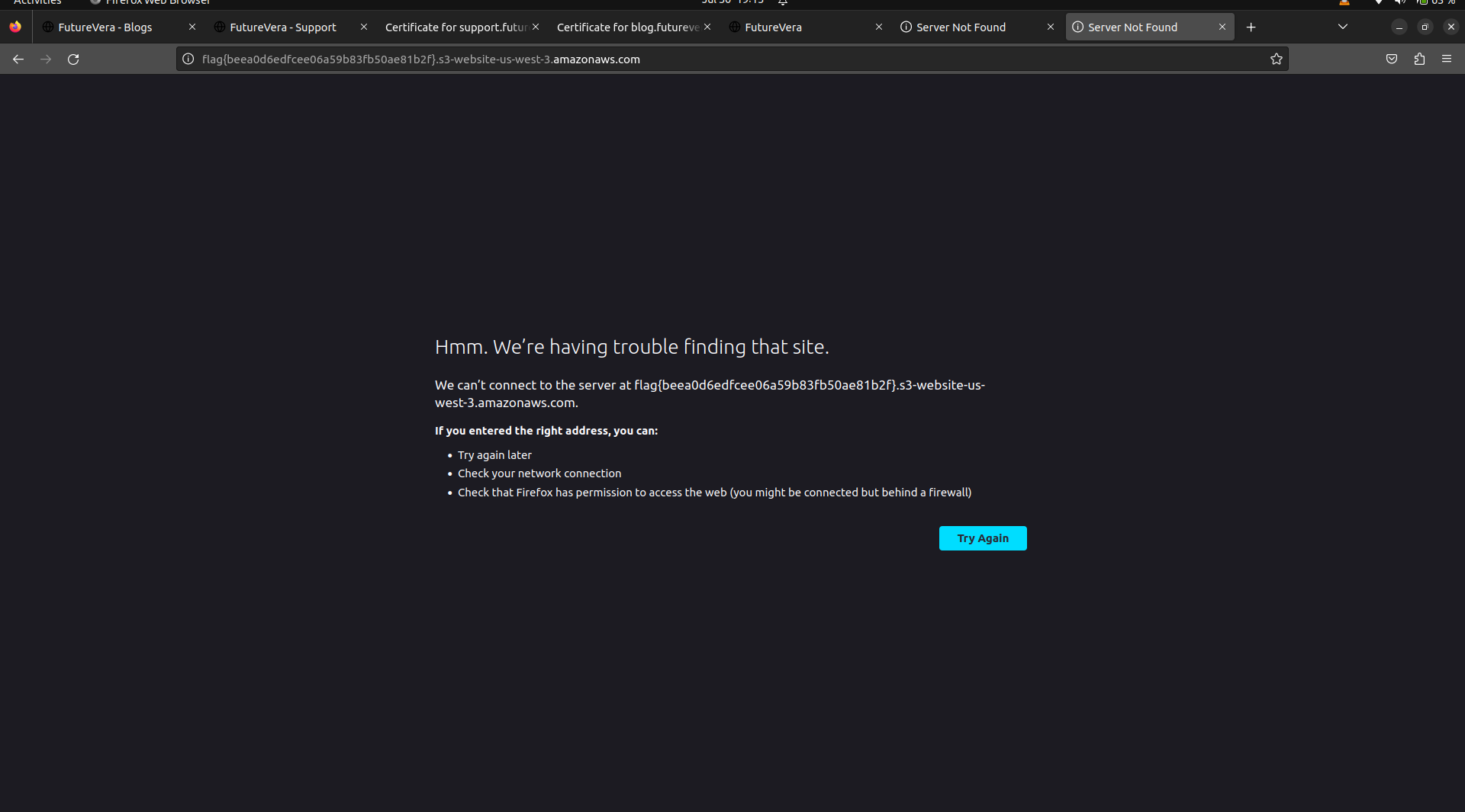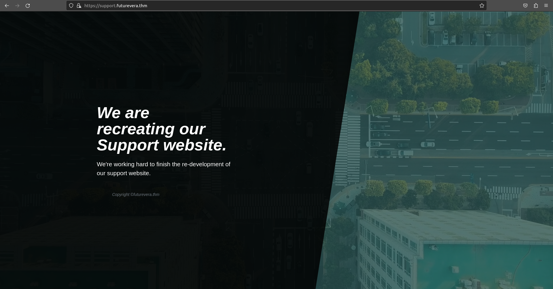 If we navigate to `secrethelpdesk934752.support.futurevera.thm`, we can see a server not found error.