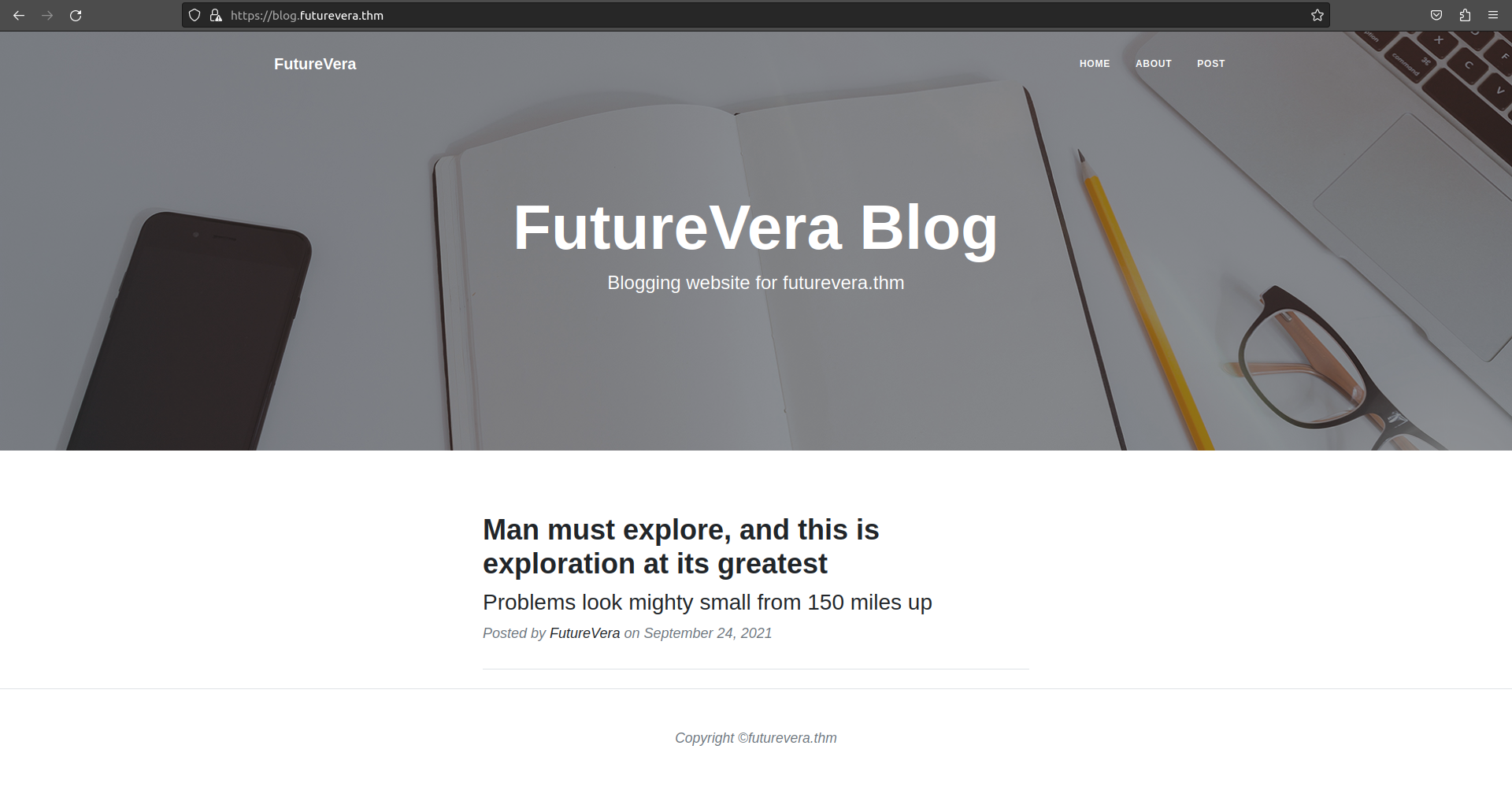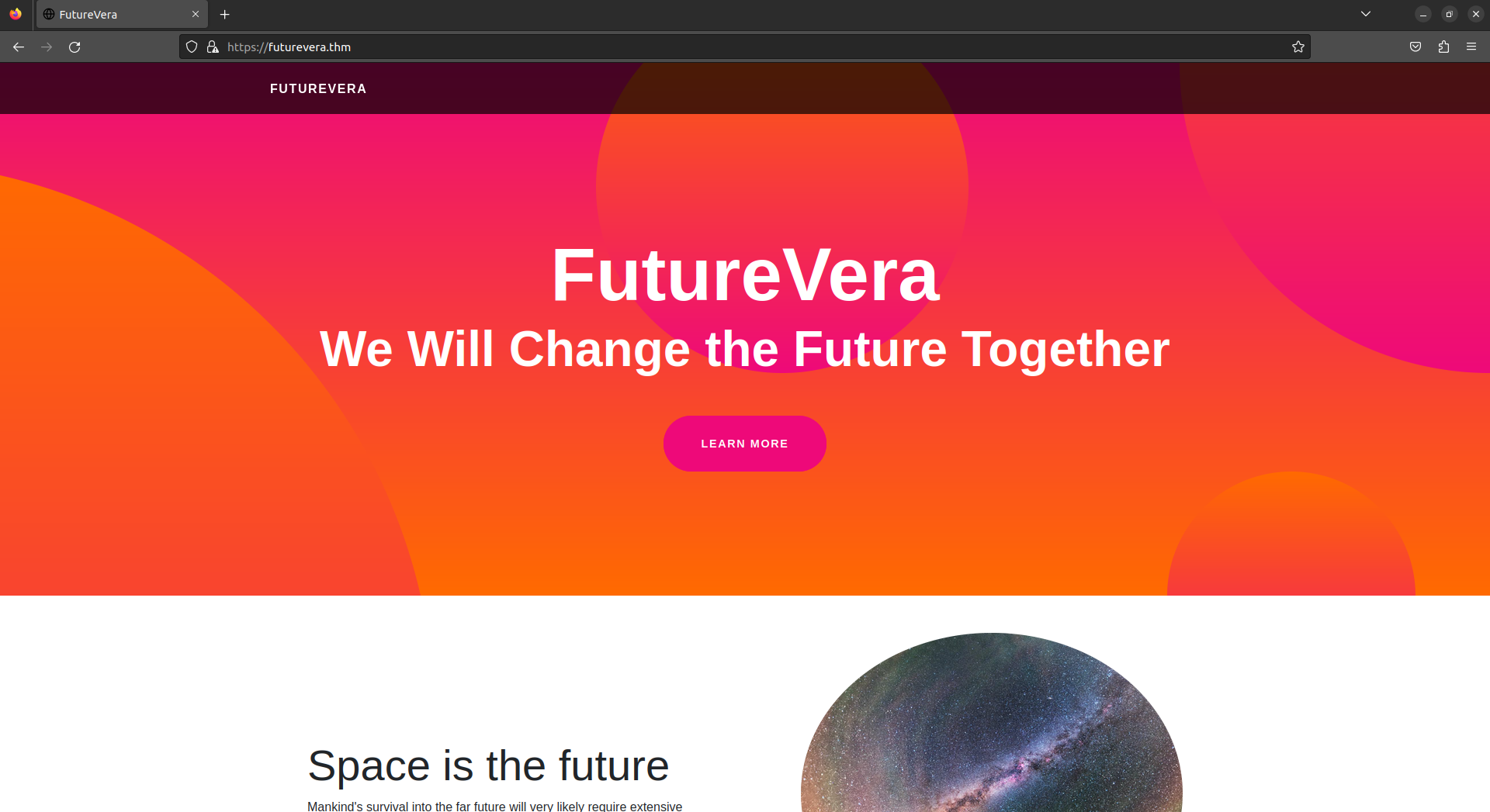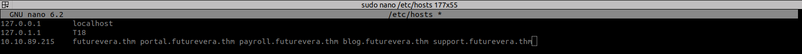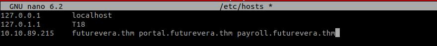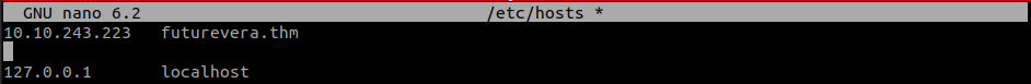 Add the Machines’s IP address to `/etc/hosts` file in your attack box with reference to `futurevera.thm` and save it.