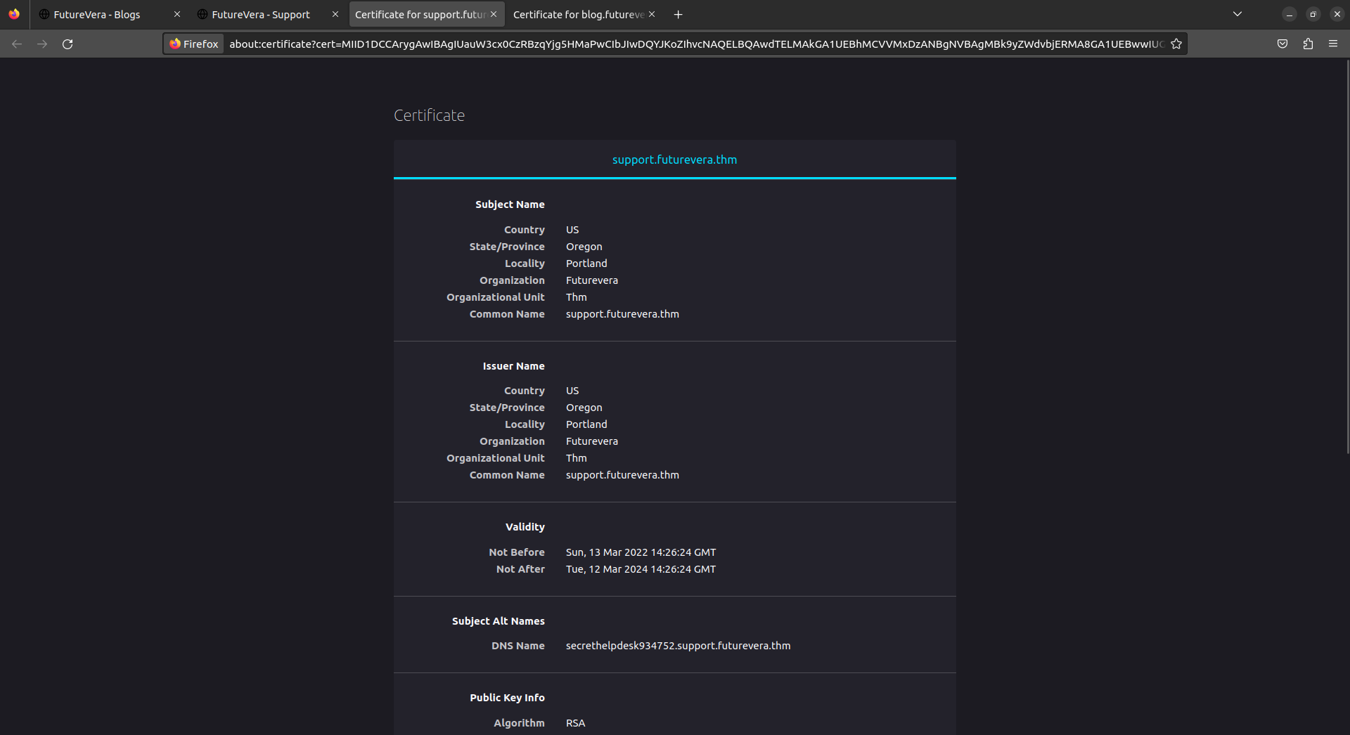 First I checked the certificate of `blog.futurevera.thm`. Didn’t found anything interesting.