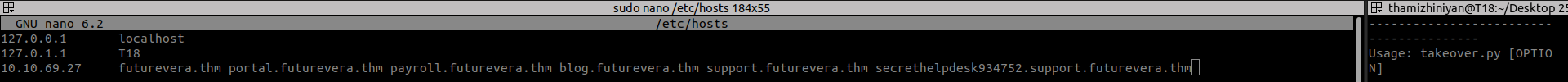 And this time found two subdomains. Now make sure to add these subdomains to the `/etc/hosts` file. You have to append the subdomains with the full url \[ Eg: `portal.futurevera.thm` ] to the previously add host separated by a space: