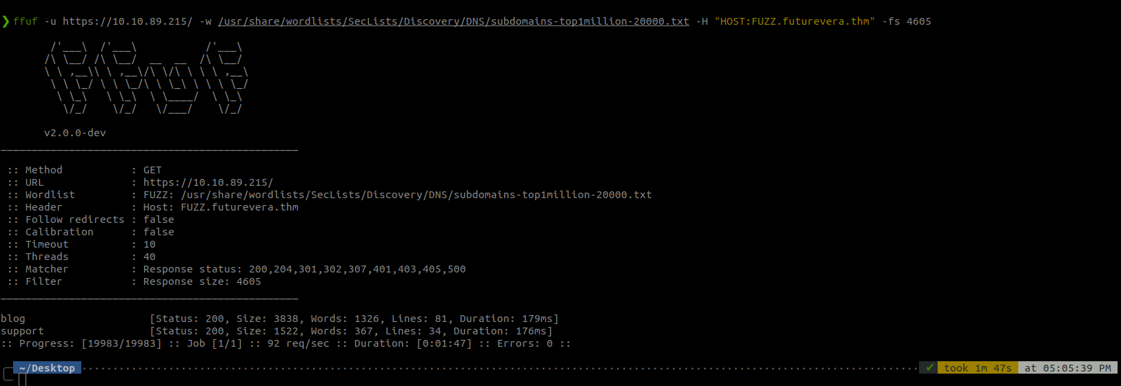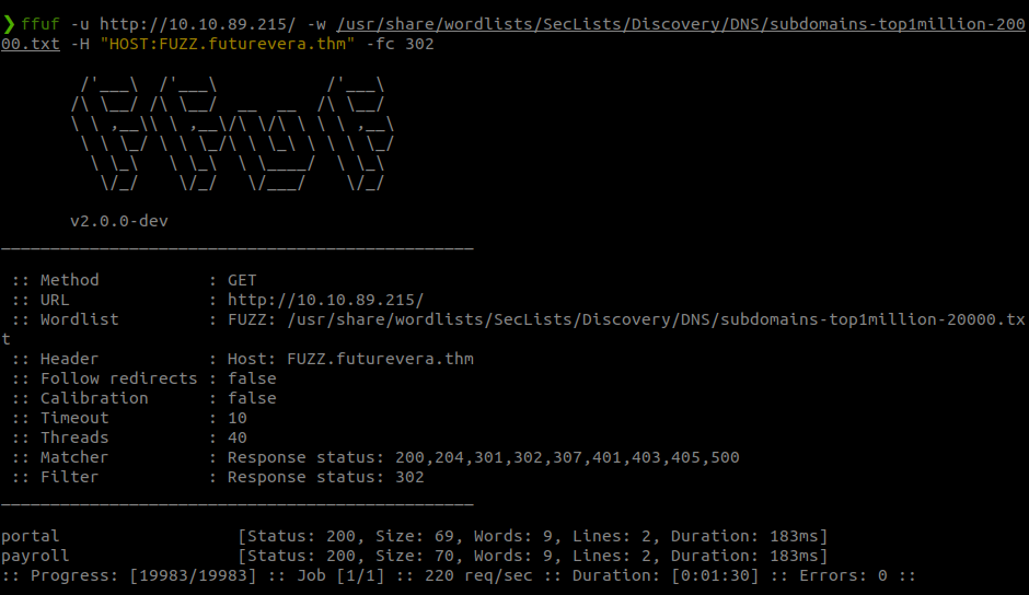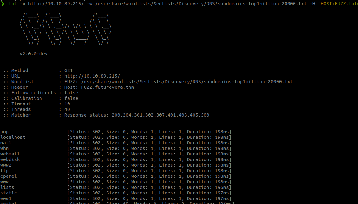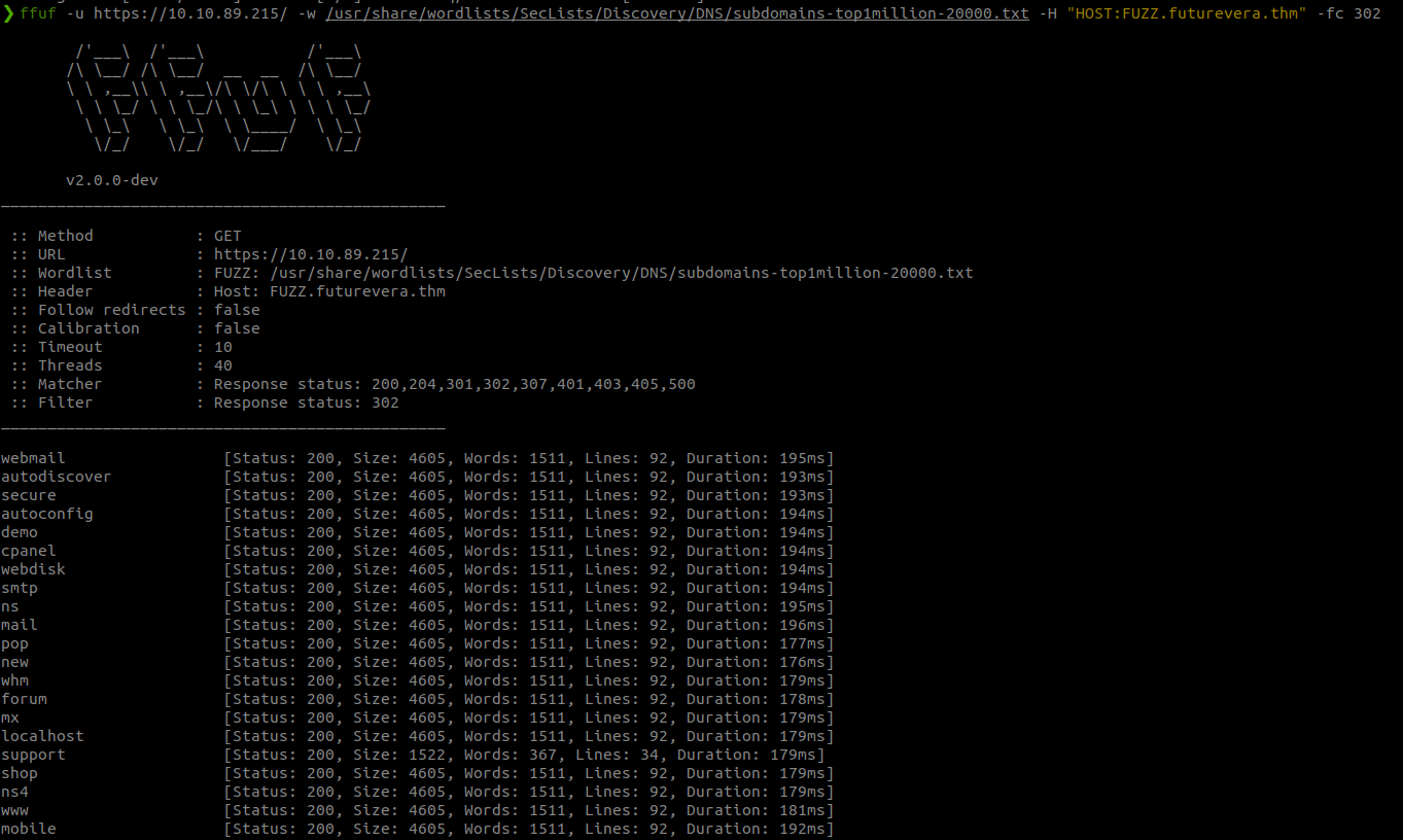 ffuf -u [http://futurevera.thm/](http://futurevera.thm/) -w /usr/share/wordlists/SecLists/Discovery/DNS/subdomains-top1million-20000.txt -H "HOST:FUZZ.futurevera.thm"